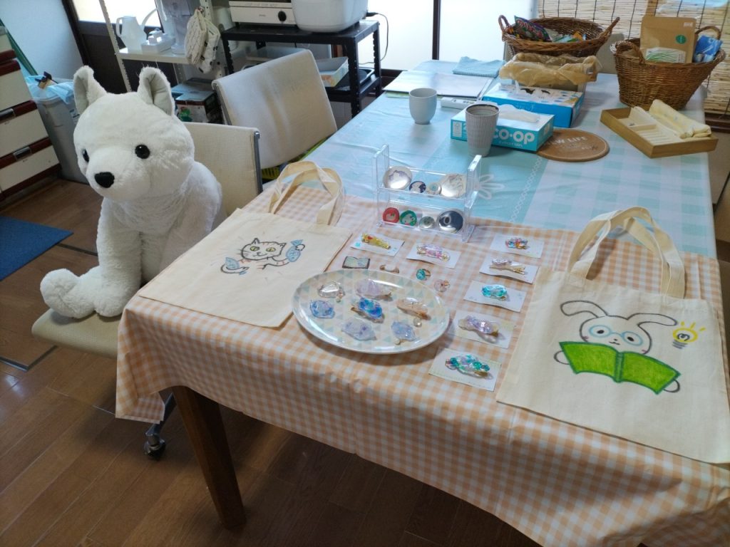 くろうささん、テーブルにクロスをひいて、アクセサリーを並べて、看板犬(まだ名前がない)を座らせて、お店シュミレーションです。