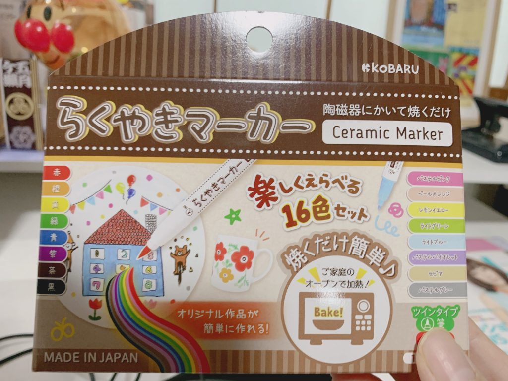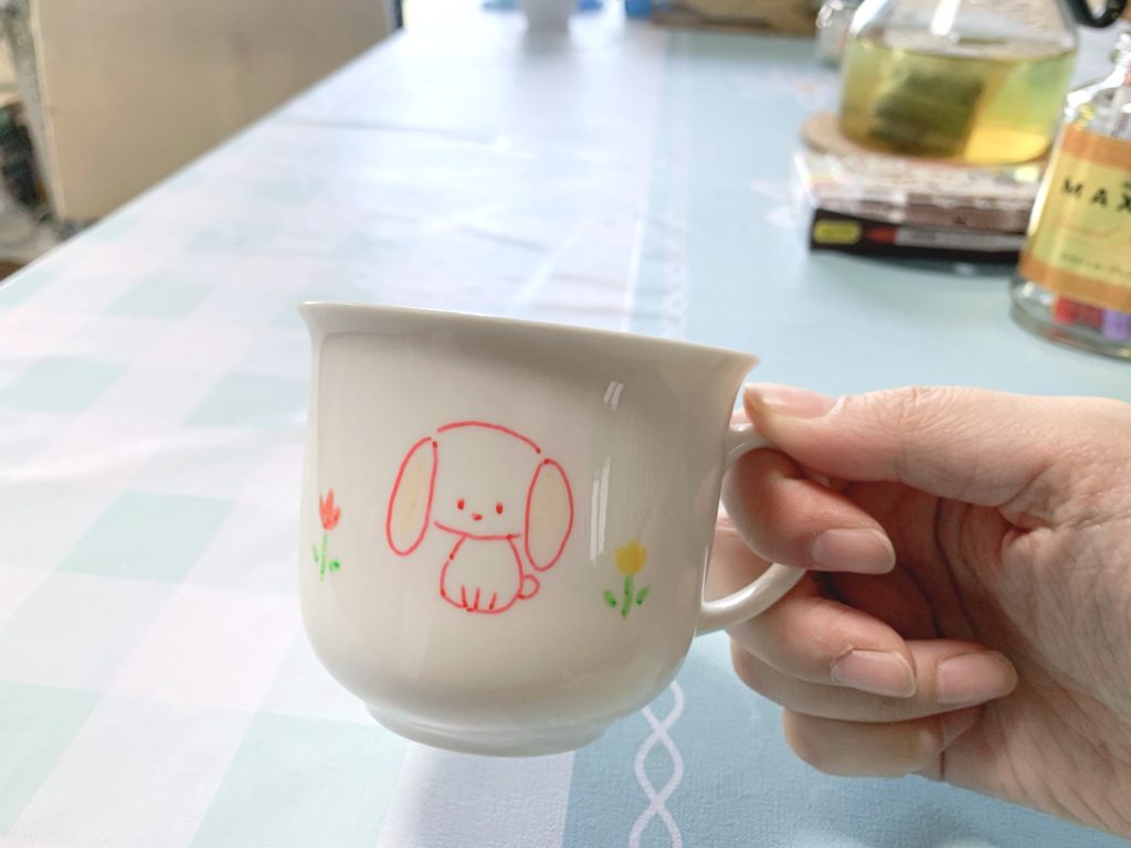 何をしたかというと、100円ショップで買った無地の陶器のコップに「らくやきマーカー」というペンでお絵描きです。