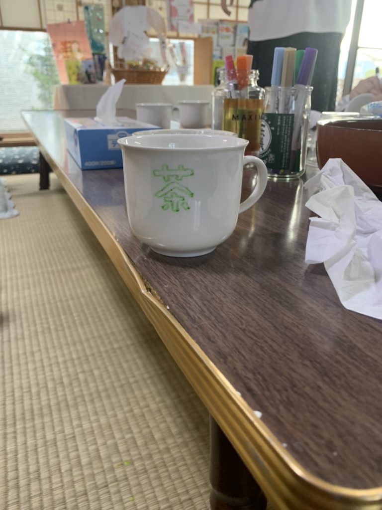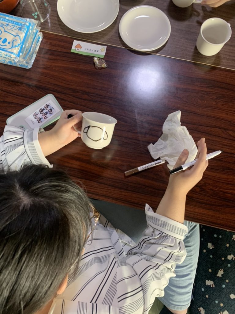 無地のマグカップやお皿に、それ用のペンで絵付けをし、あとはオーブンで焼いて定着させます。