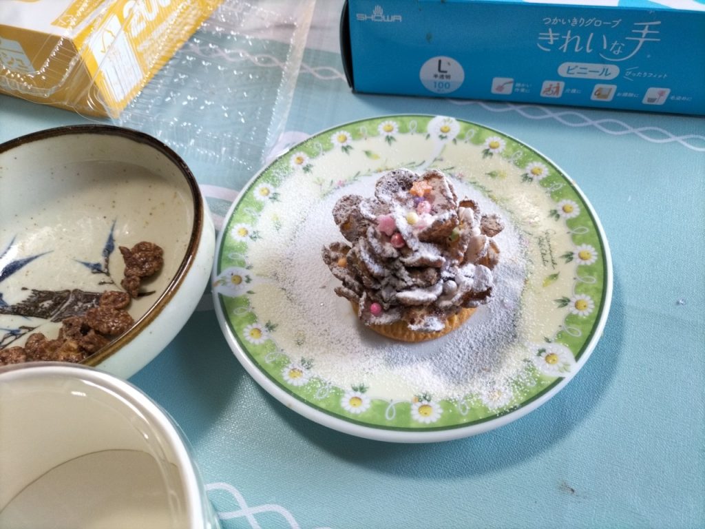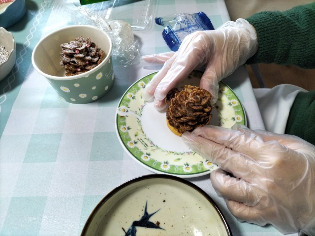 今日、こむふくでは、松ぼっくりケーキ作りをしました。