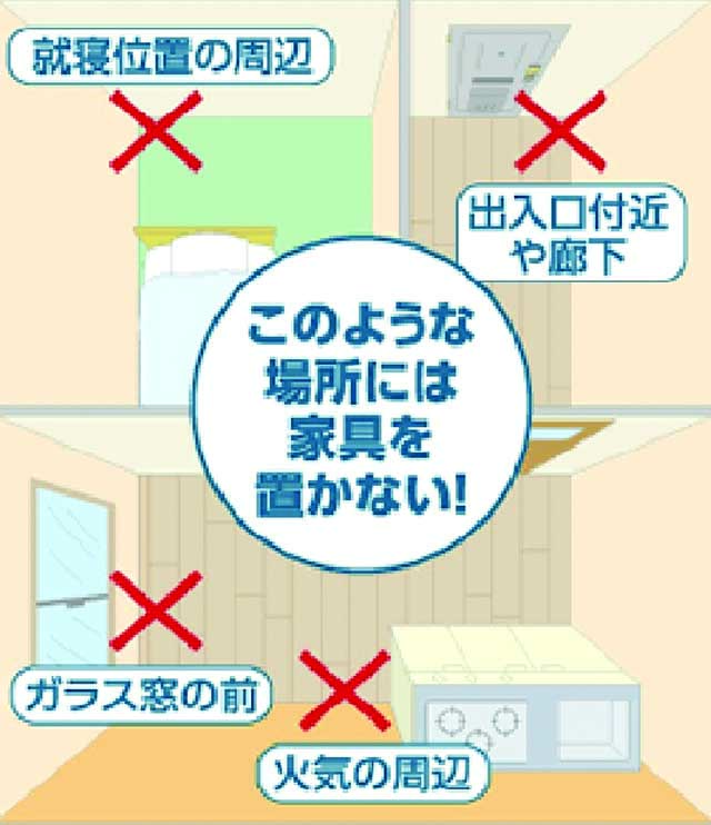食料の備蓄、情報入手の方法、家具の転倒防止、ガラスが割れた時の対策、逃げるための動線の確保、などなど。