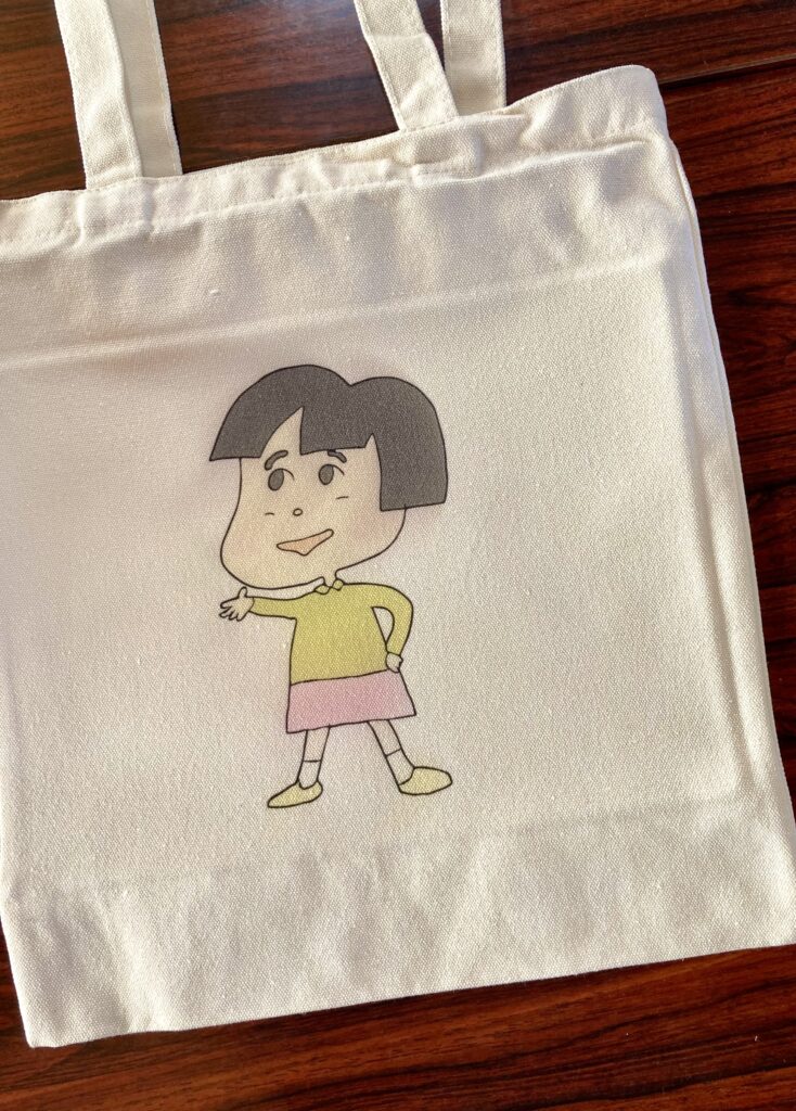 本日もプリンターで、トートバッグに印刷しました。こむふくではおなじみの施設長が描いた田中代表のイラストです。バッグになったことで、キャラクターの愛らしさが増したような気がします。