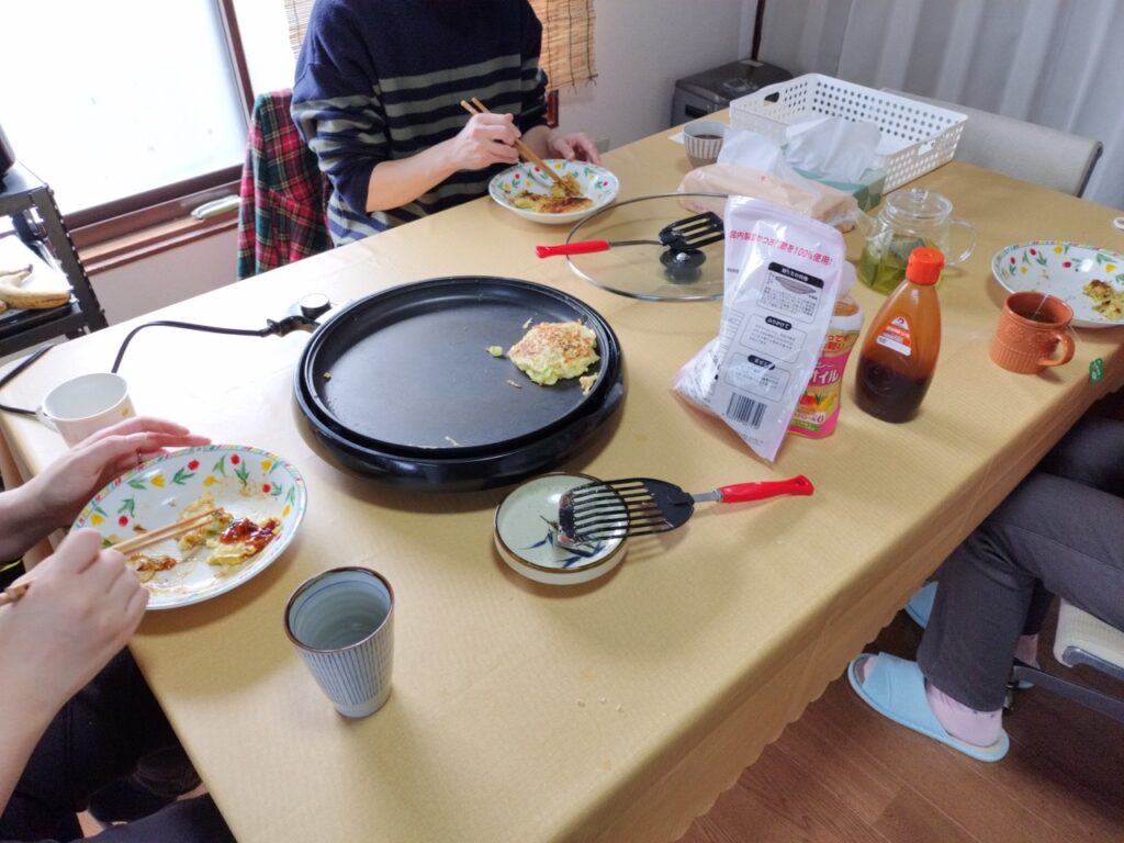 ゲストのくろうささん友人、メンバーさん、スタッフで、ホットプレートを2台かこみ、お好み焼きを美味しくいただきました。