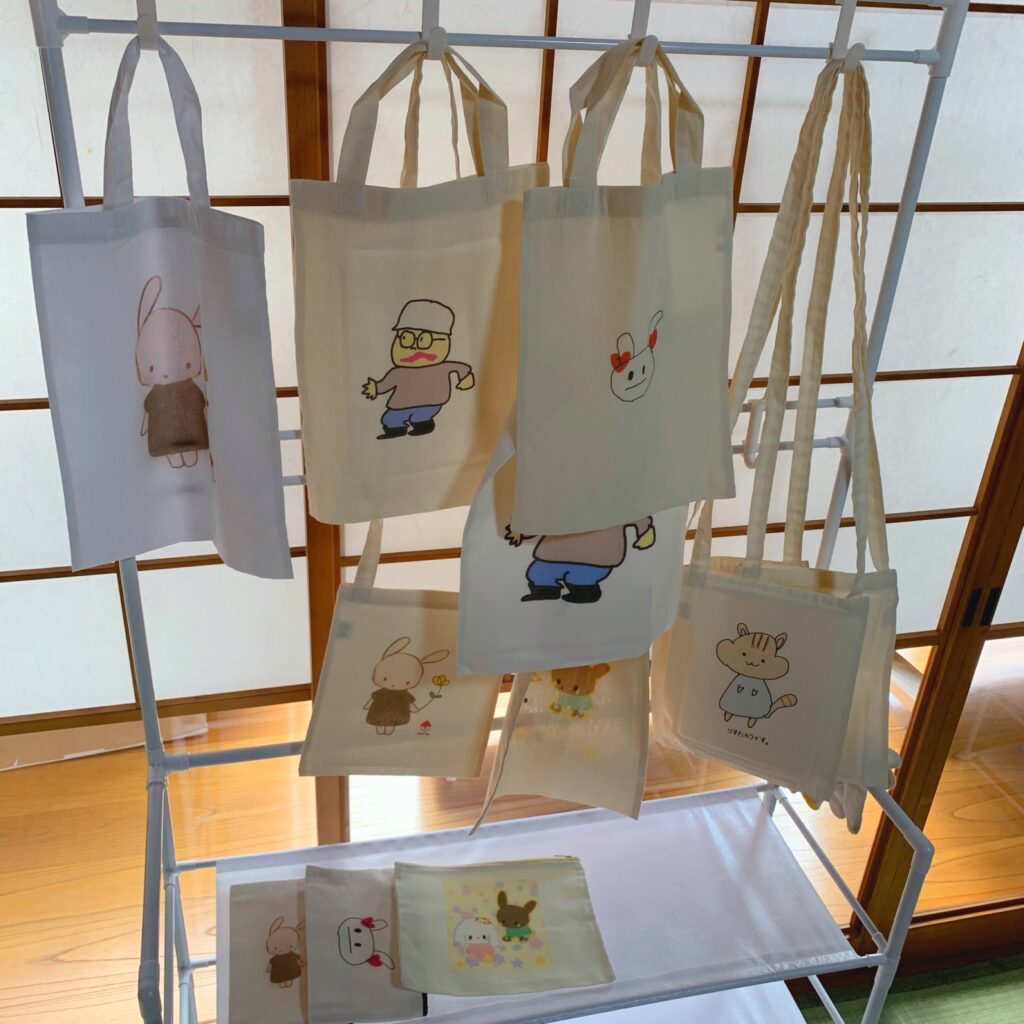 こむふくにあるipadで描いたイラストやメンバーさんがお家でスマホで描いてくれたイラストをどんどんトートバッグにしていっています。