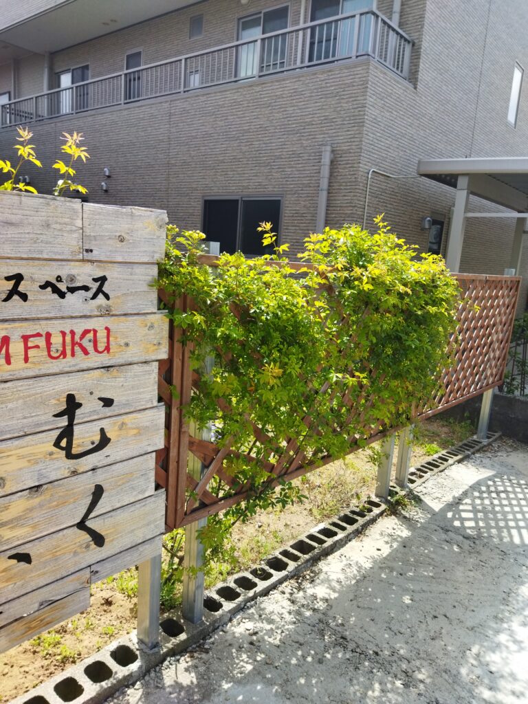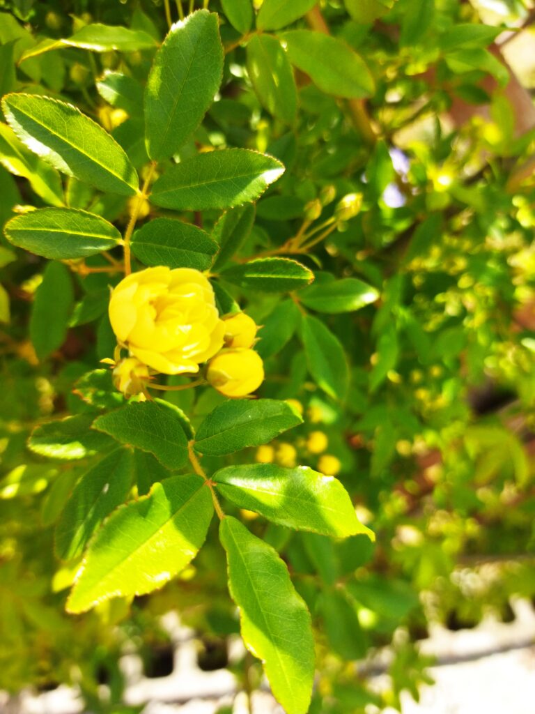 こむふくの前のラティスに、初めて黄色の木工バラが咲きます