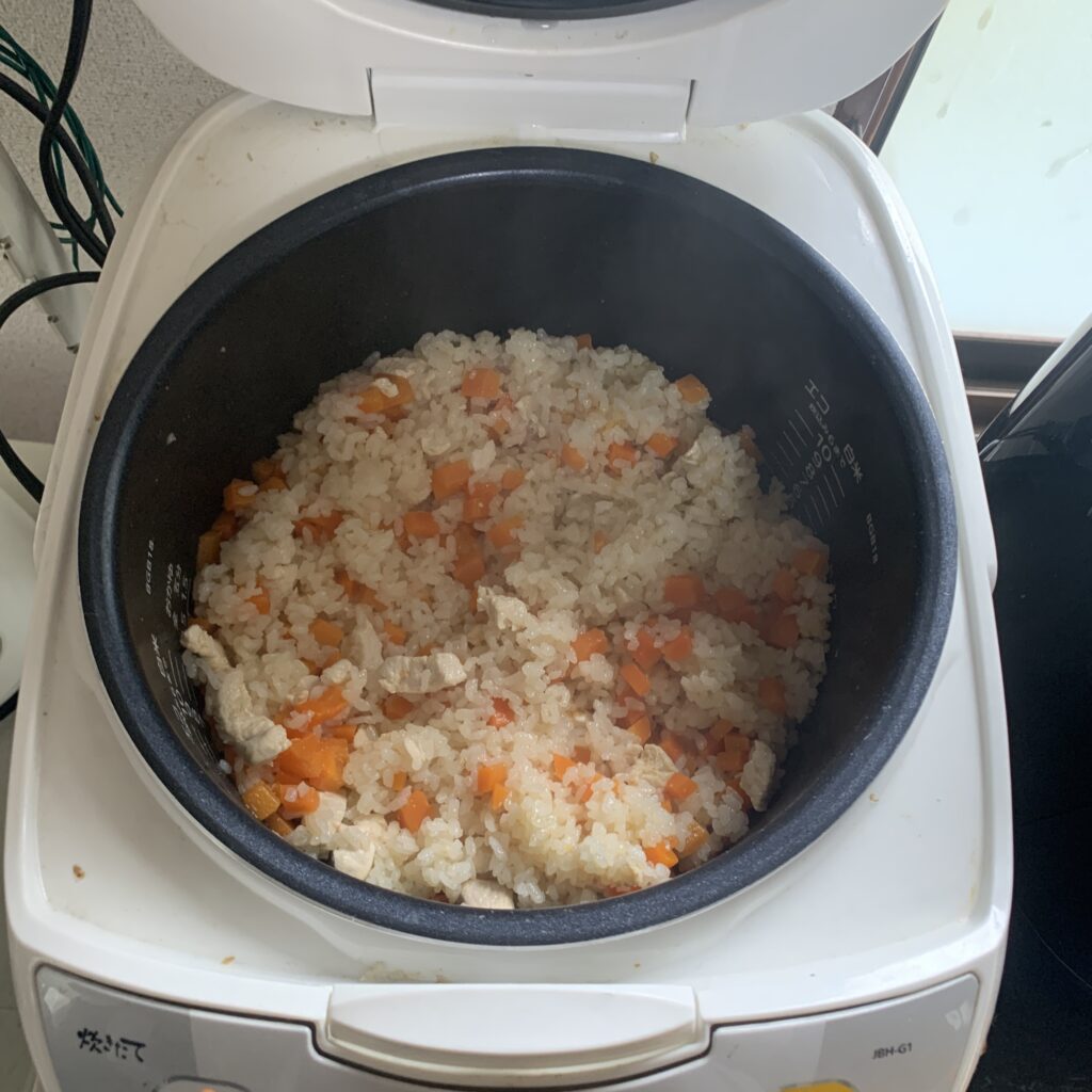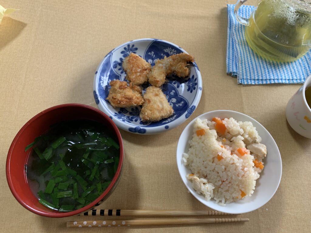 今日のお昼ご飯は和代さん特製キャロットチキンライスにガーリックカツ、いしる入りのお味噌汁でした。