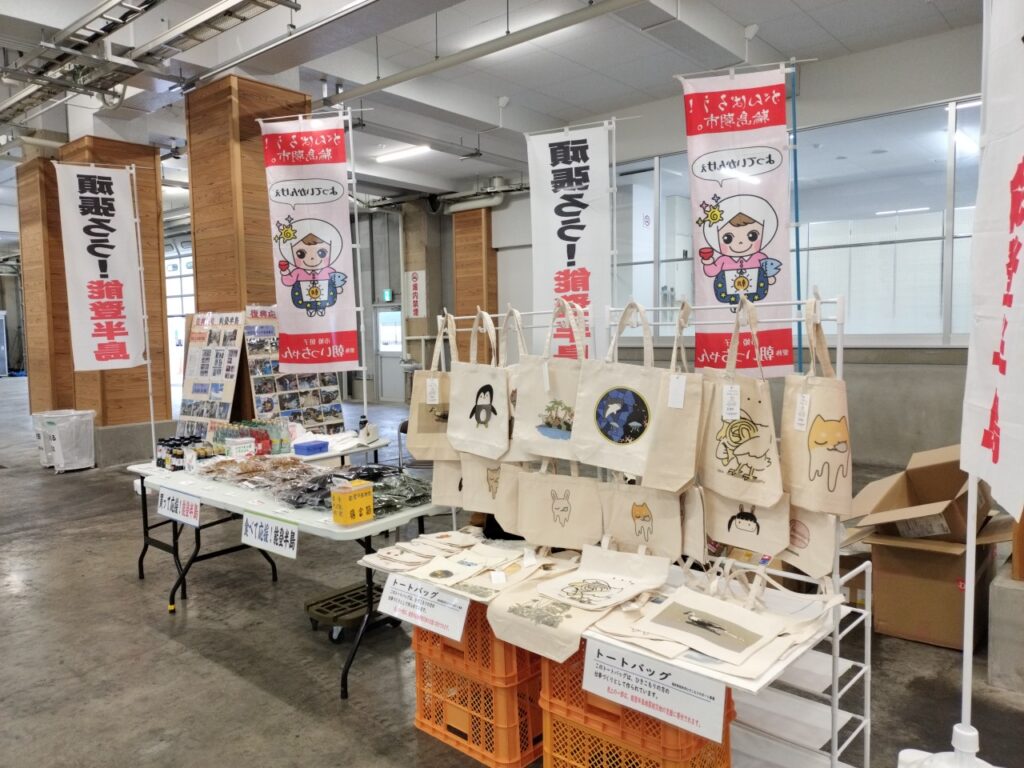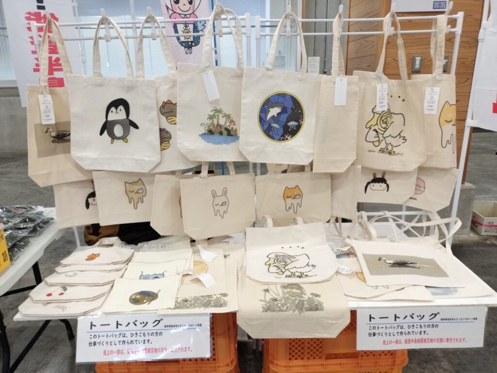 こむふくトートバッグの並べ方も手に取ってもらえるように工夫しているつもりですが、どうでしょうか。