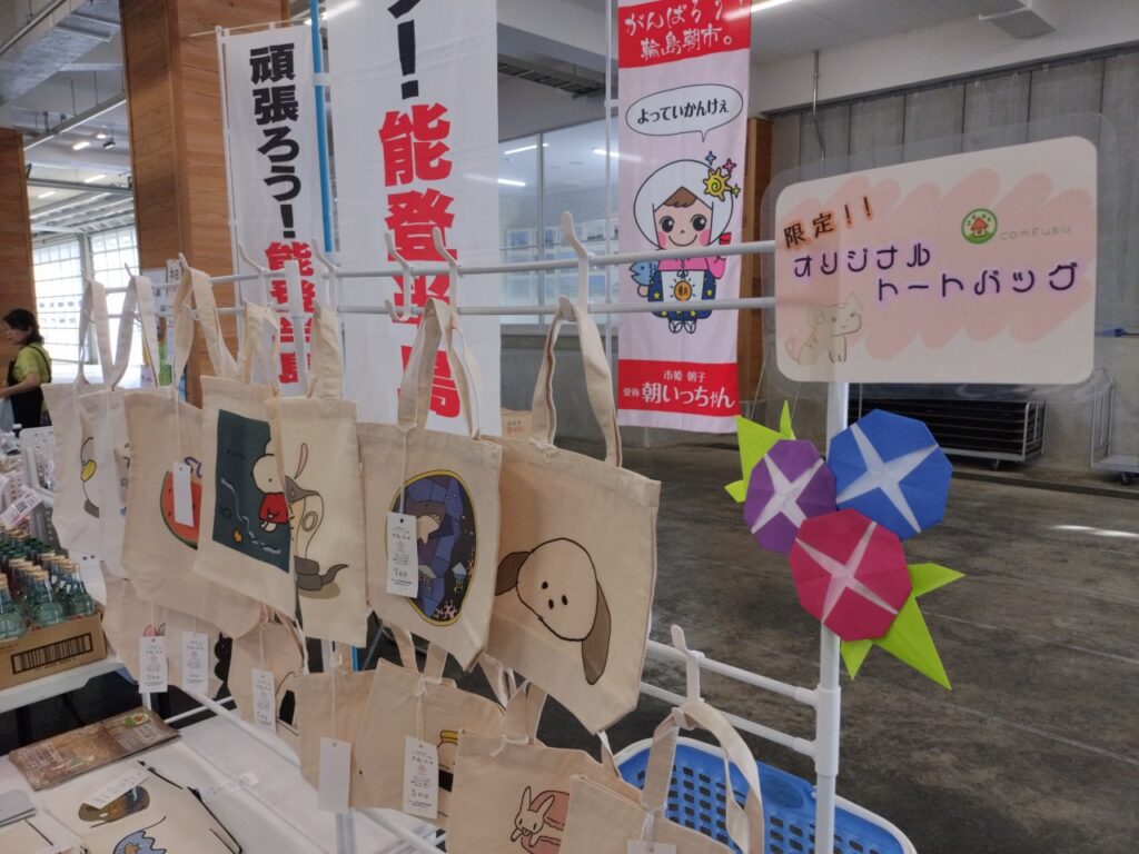 こむふくイラストレーターの皆さんのデザインしたオリジナルトートバッグも販売していますので、ぜひ見に来てください。