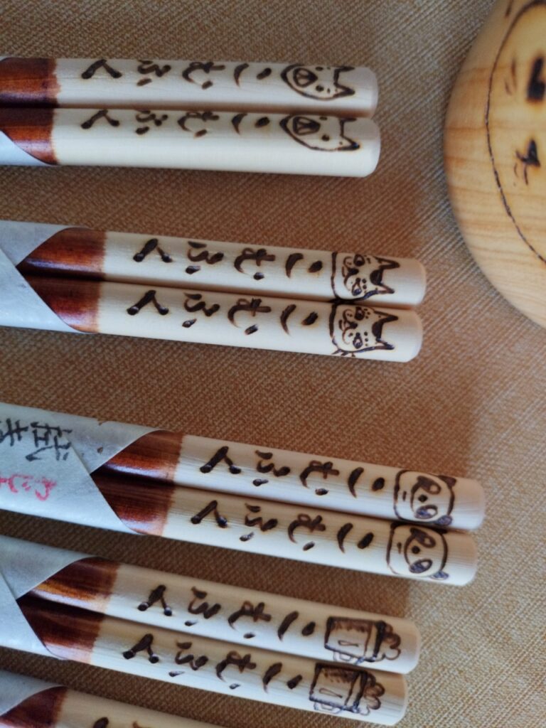 マグカップや箸に、手描きのイラストや名前を入れてくれる店です。