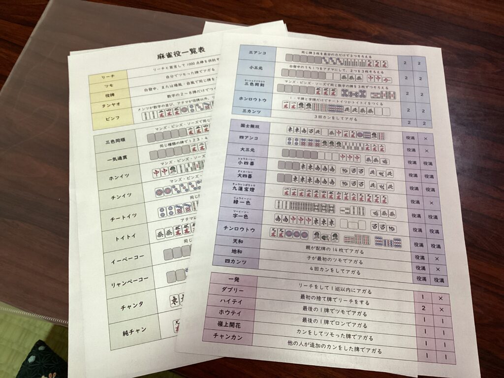 初心者しかいなかったので、みんな麻雀のアガリ役一覧表と睨めっこしながらなんとか役をつくりました。