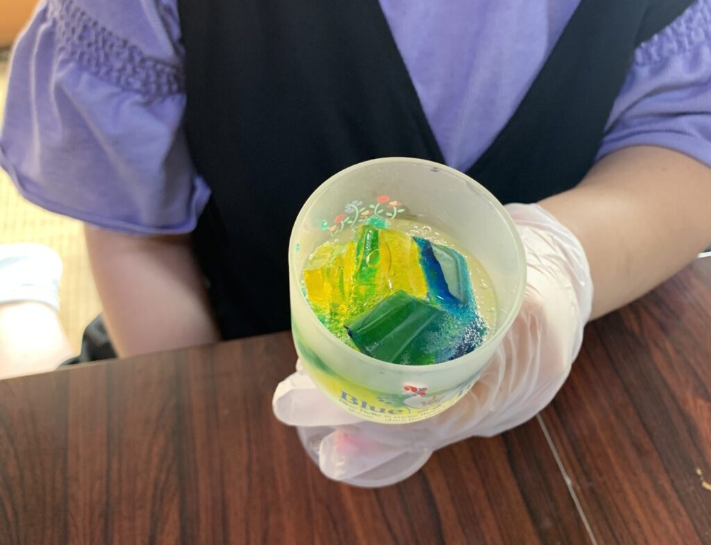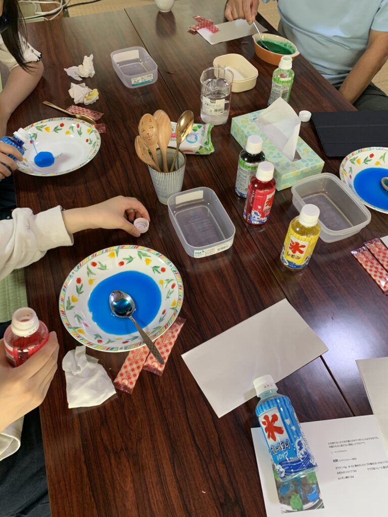 みんなが作ったグミをちょっとずついただきながらそれぞれカラフルなグミソ-ダができました。