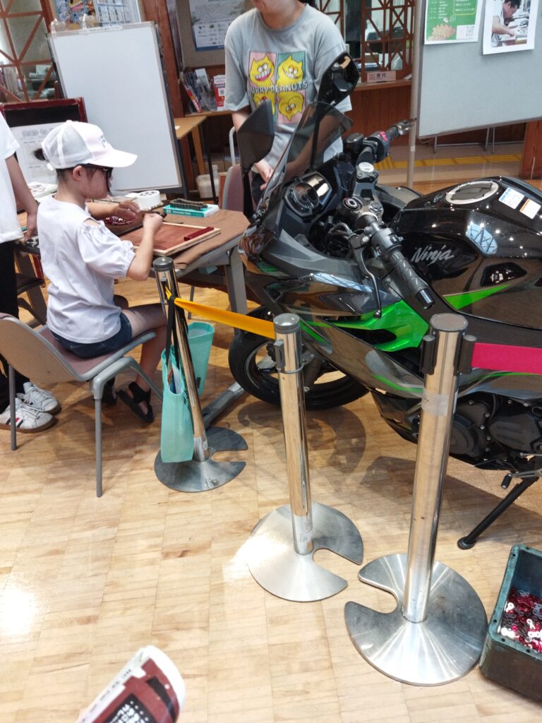 写真は、ある施設が引き受けている作業です。オートバイのチェーンの部品を並べる仕事です。かっこいい「ninjya」というオートバイも飾ってありました。