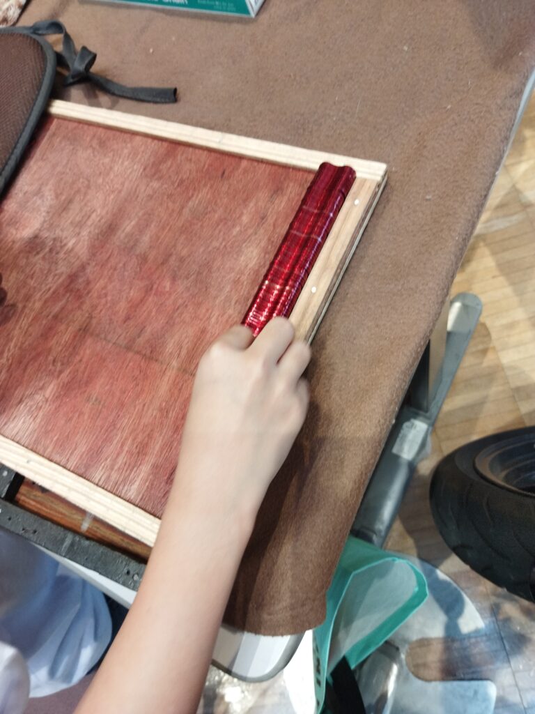 チェーンの部品を並べている場面です。参加者が体験していました。