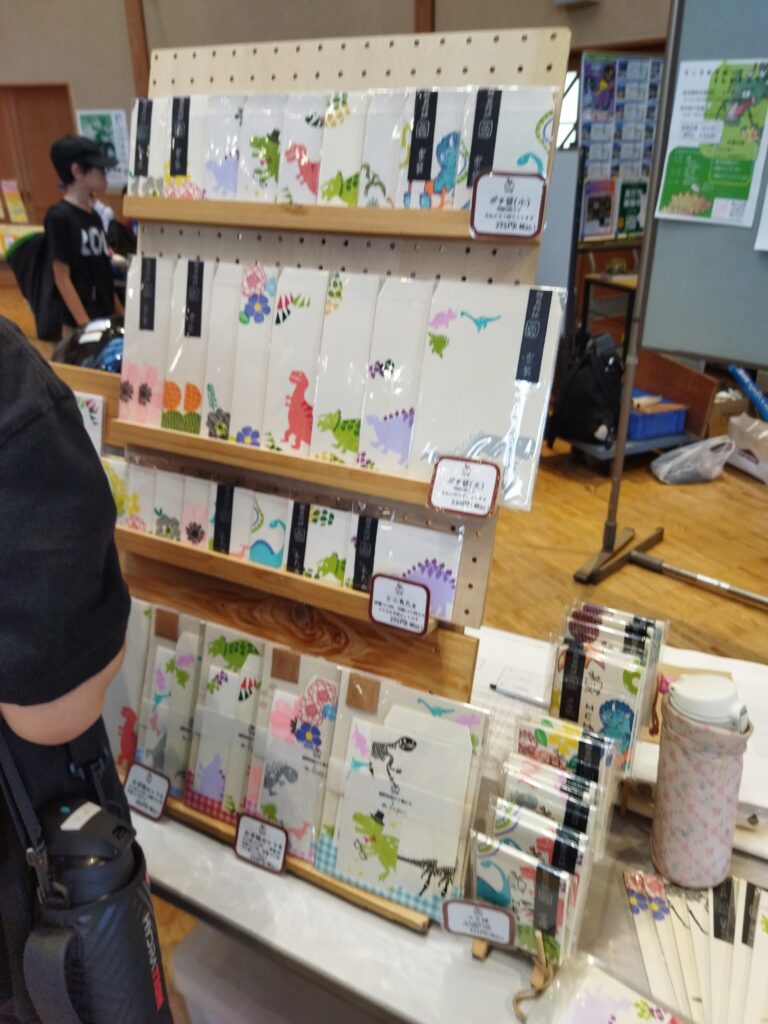 写真は、消しゴムハンコを施設で作り、封筒などに押してプリントして製品化したものです。素人離れした素敵な作品でした