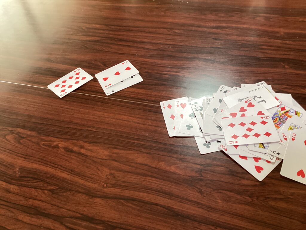 ジリジリと手札を減らしていき、ここぞというタイミングで山札を流して、自分の手札を捨てていきます。