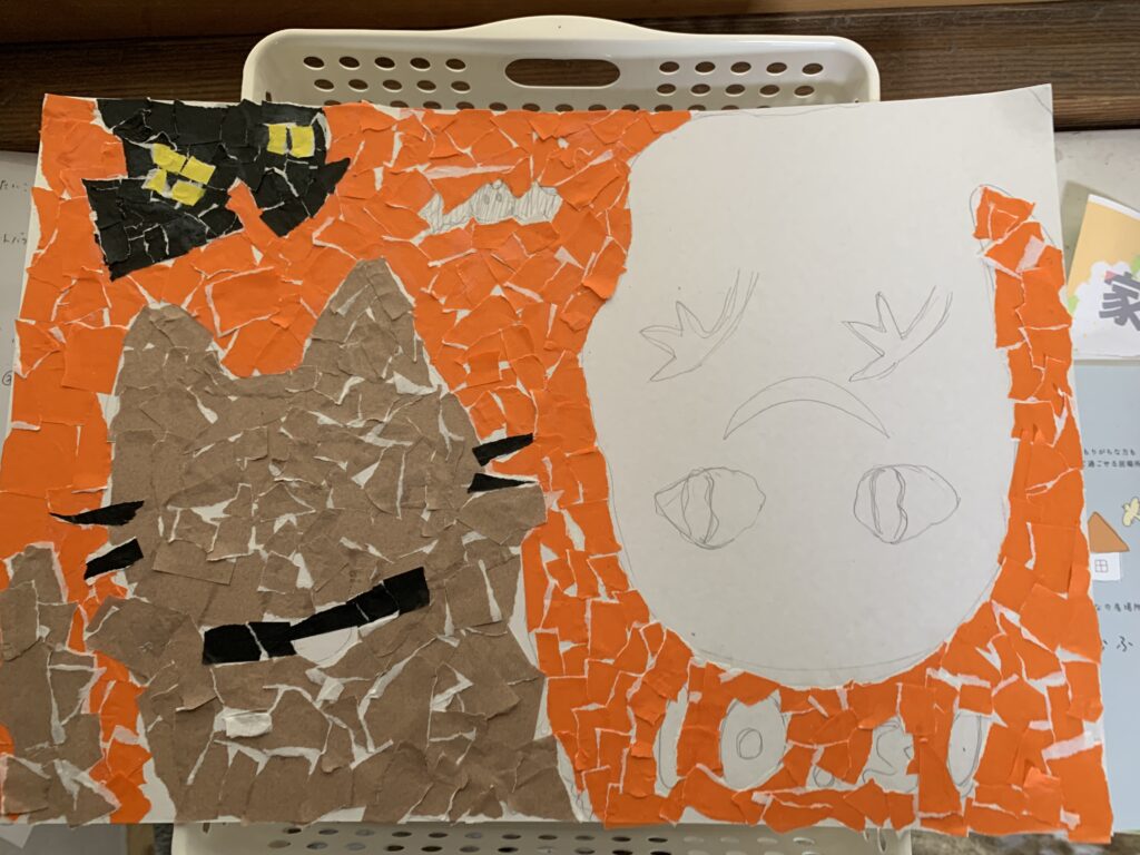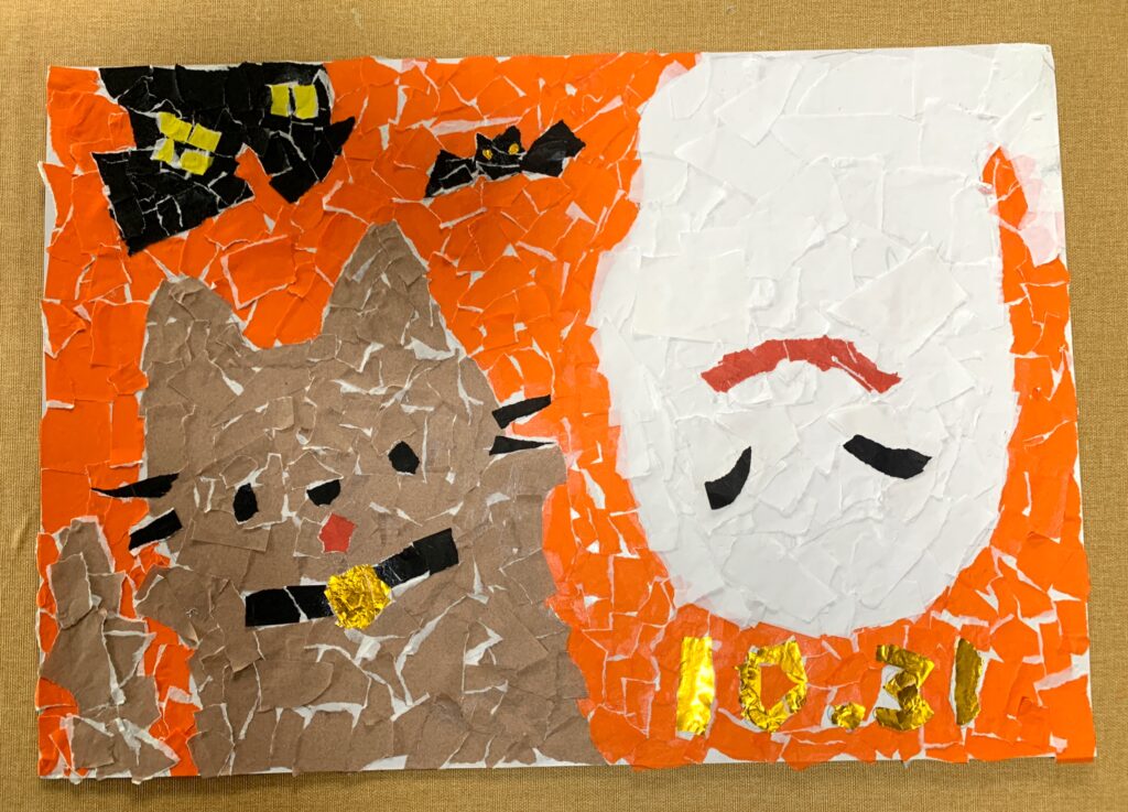 秋は創作の季節、そう11月はハロウィン飾りづくり月間ということで、最近こむふくでは貼り絵や折り紙をよくしています。
