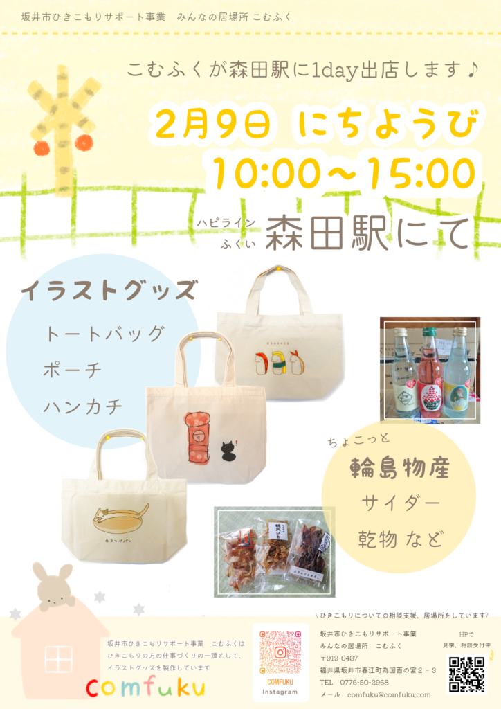 今日はこむふくでみんなで作っているトートバッグとごとう氏の輪島の復興応援の物産販売(縮小版)の出店のお知らせです。