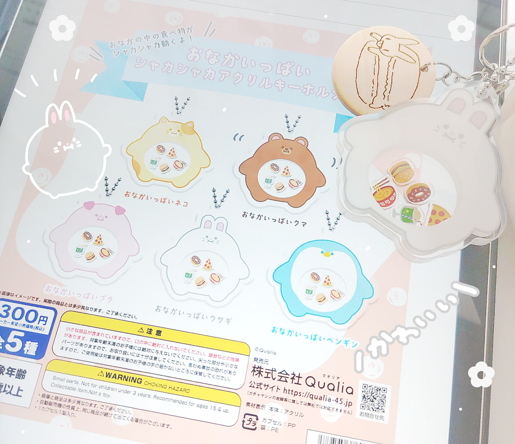 「おなかいっぱいシャカシャカアクリルキーホルダー」というものなのですが、動物たちの丸いフォルムがかわいくないですか?🐰