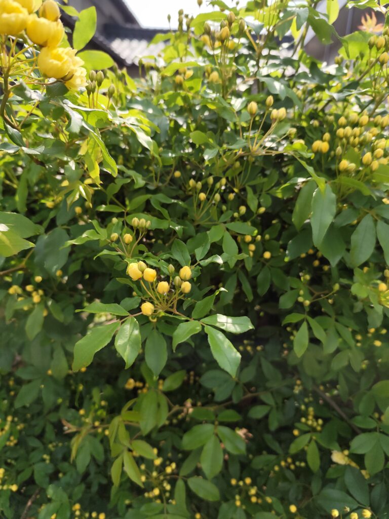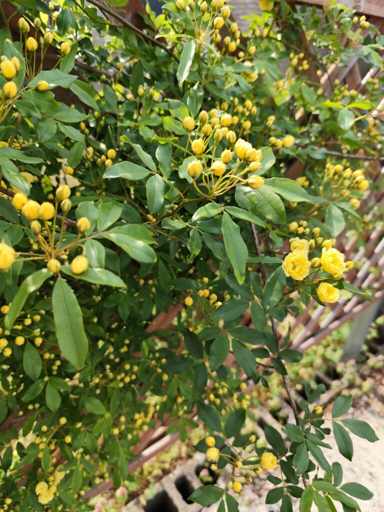 こむふくの入口に黄色の木香ばらがもうすぐ満開になります。