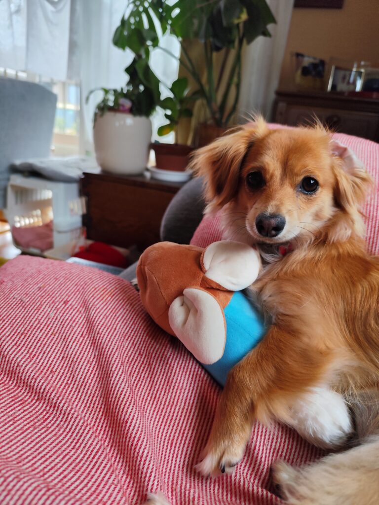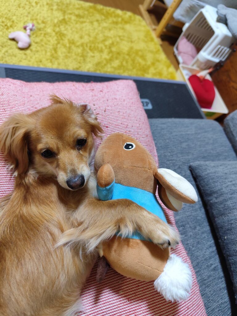 こむふくスタッフから頂いたウサギのぴょんちゃんと遊んでいます