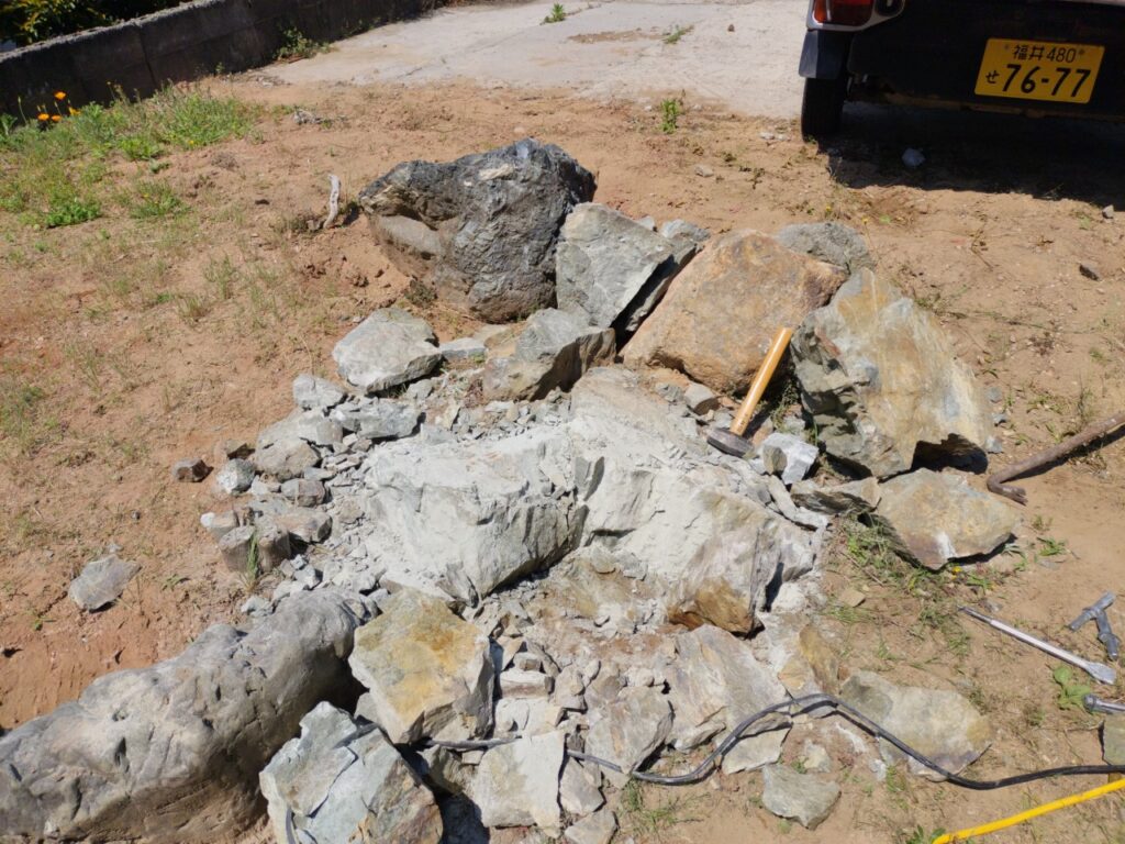 駐車場拡張計画ですが、人力で石を割って撤去することに決めました。