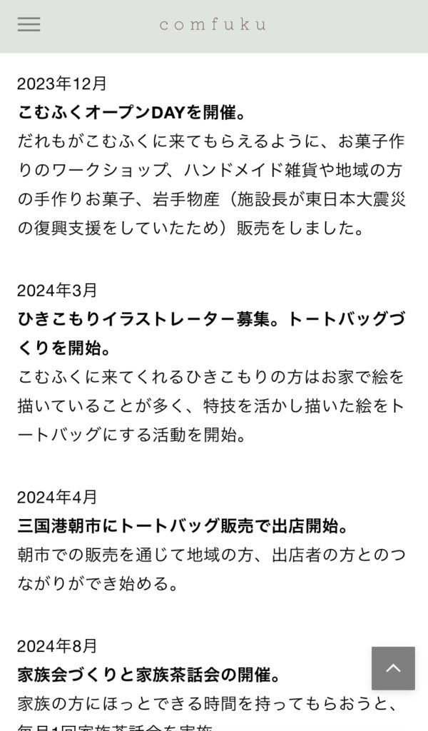 今日は、こむふくの事業についてのホ-ムペ-ジ(comfuku.com)をいじっていました。中にこむふくの今までというページがあるのですが、2023年で止まってしまっていて、慌てて2025年までの歩みを更新しました。