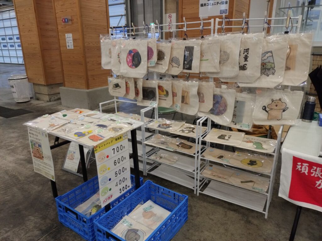 仕入れてきた輪島朝市商品と、こむふくオリジナルトートバッグの販売です。