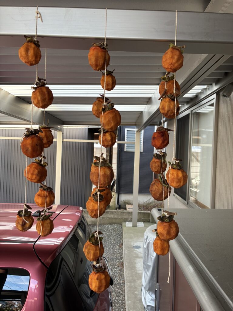 生まれて初めて、干し柿を作りました。まず柿の皮をむきました。そして、紐に吊るしました。柿がすべって、ひもに吊るすのがちょっと大変でした。風通しの良いところに干すようにアドバイスを受けたので、車庫に干しました。3日ほどすると、表面が乾いてきました。毎日毎日見るのが楽しみになってきました。