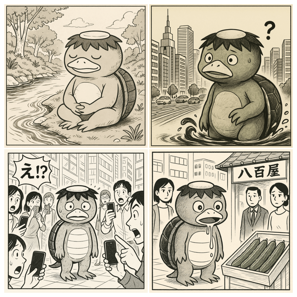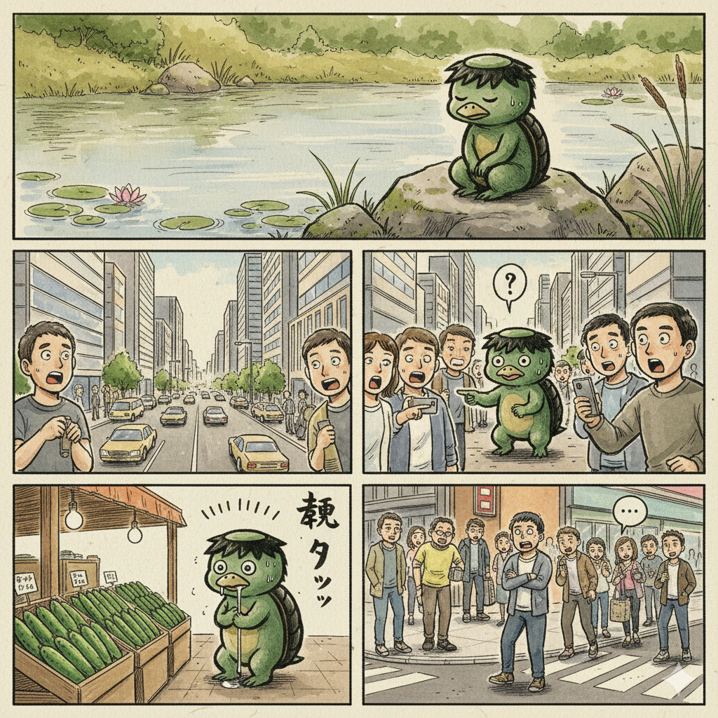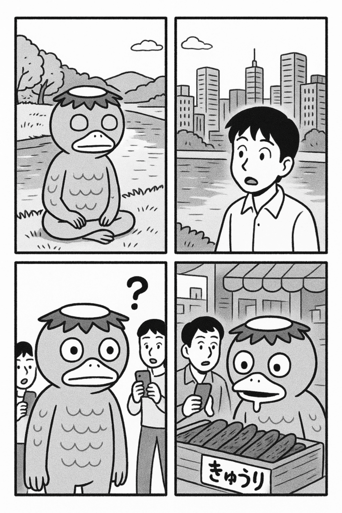 河童が人間社会に表れる4コマ漫画