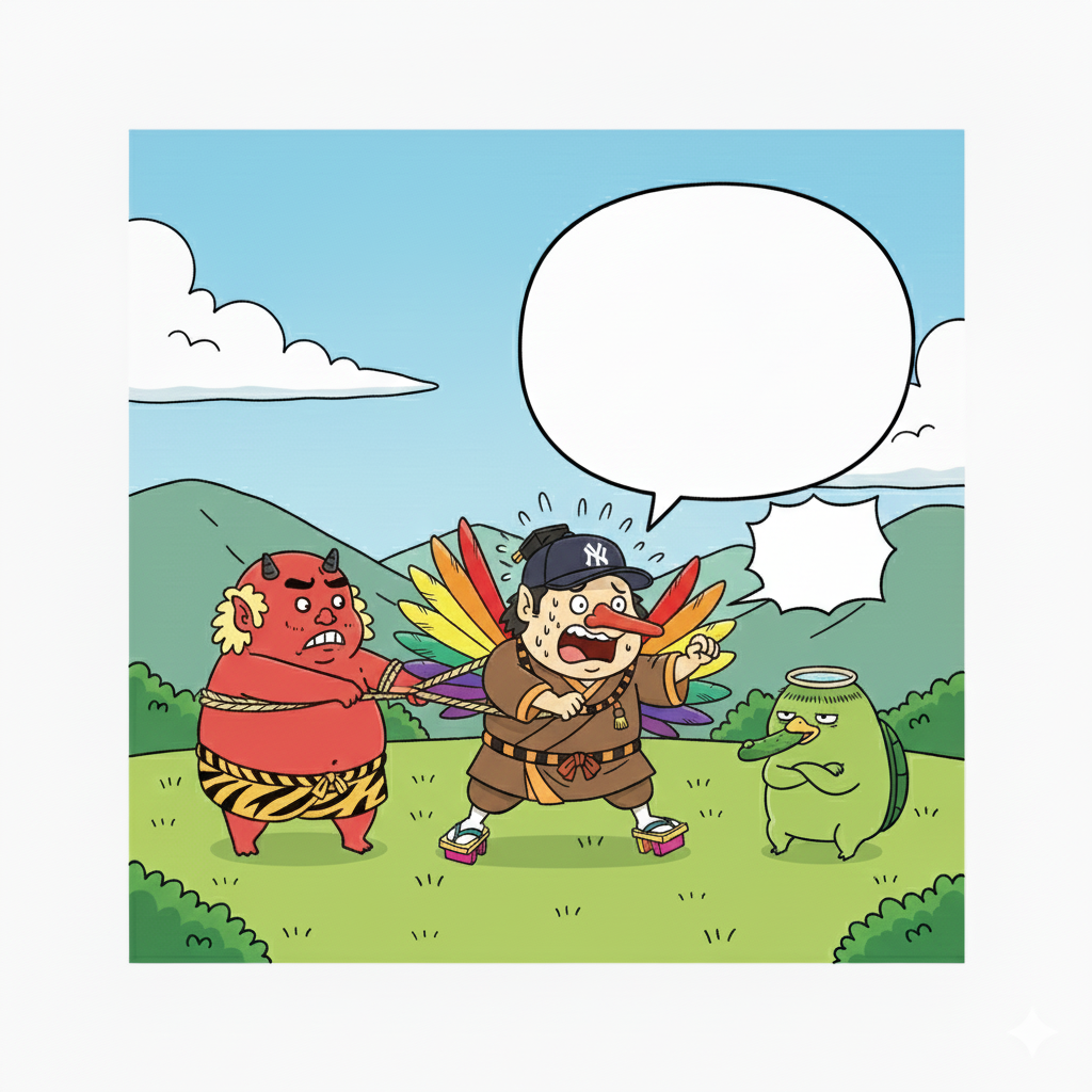 天狗は「やめてくれ~!」と叫んでいます。(吹き出しの場所がおかしい)